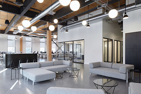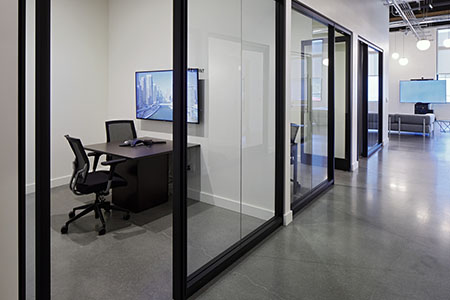 Interior office renovation featuring updated washrooms, modern furniture, post and beam accents, and an open ceiling design. The storefront boasts sleek office walls and polished concrete floors.
